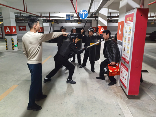 與此同時,應急處置崗隊員也攜帶防暴盾牌、橡膠棍等專業(yè)器械火速集結(jié),以最快速度抵達地下車庫指定區(qū)域。面對負隅頑抗的 “盜竊分子”,隊員們沉著冷靜,憑借日常訓練形成的默契配合,迅速結(jié)成戰(zhàn)術(shù)小組,從不同方向?qū)?“盜竊分子” 實施包圍,果斷出擊、動作規(guī)范,僅用數(shù)分鐘便成功將其治服,并移送公安機關(guān)處理。